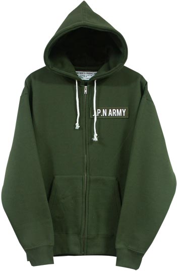 | Name.................J.P.N ARMY HOOD Size...................M,L,XL Color.................Olive Material.............65% Polyester 35% Cotton 10.3 oz Price.................¥ 9,450 (税込) |